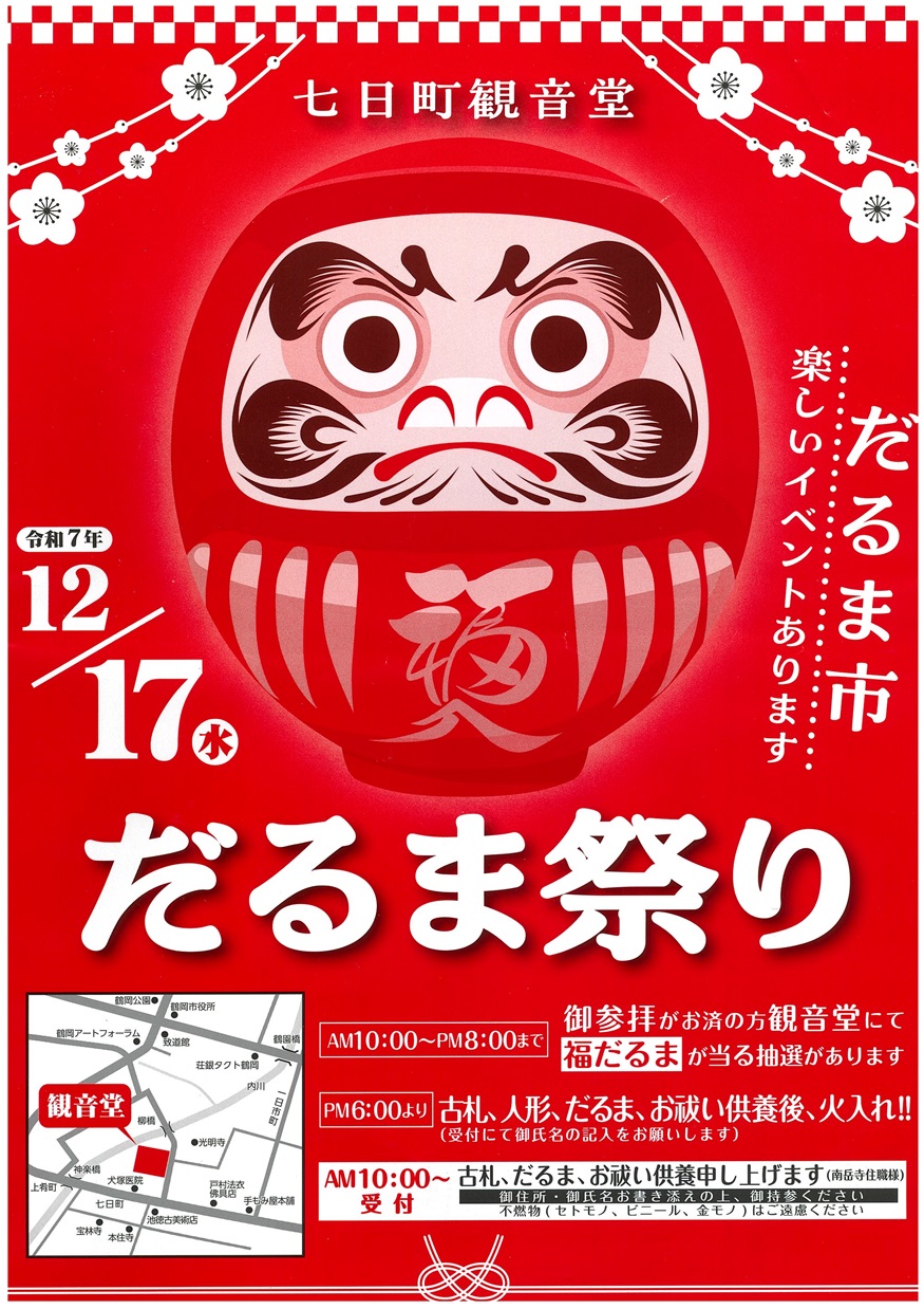 藩政時代、観音堂の近くの遊郭の遊女たちが「七転び八起き」のだるまにあやかって早く苦界から逃れたいと祈って買い求めるのが流行してから、多くの店が出るようになったと伝えられています。